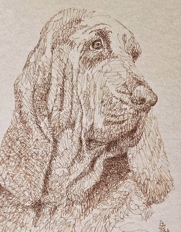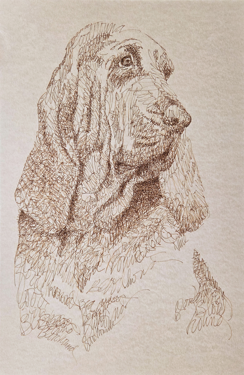 Bloodhound art portrait has hand applied pen and ink, making each print an original artwork. These unique fine art 11″x 17″ lithographs, created by drawing the name of the breed over and over, are hand signed and numbered in editions of 500 by internationally known artist Stephen Kline. His collectors number in the thousands from over 20 countries and every state in the US. Kline’s dog art has generated tens of thousands of dollars for dog rescues worldwide. Fast, free shipping.